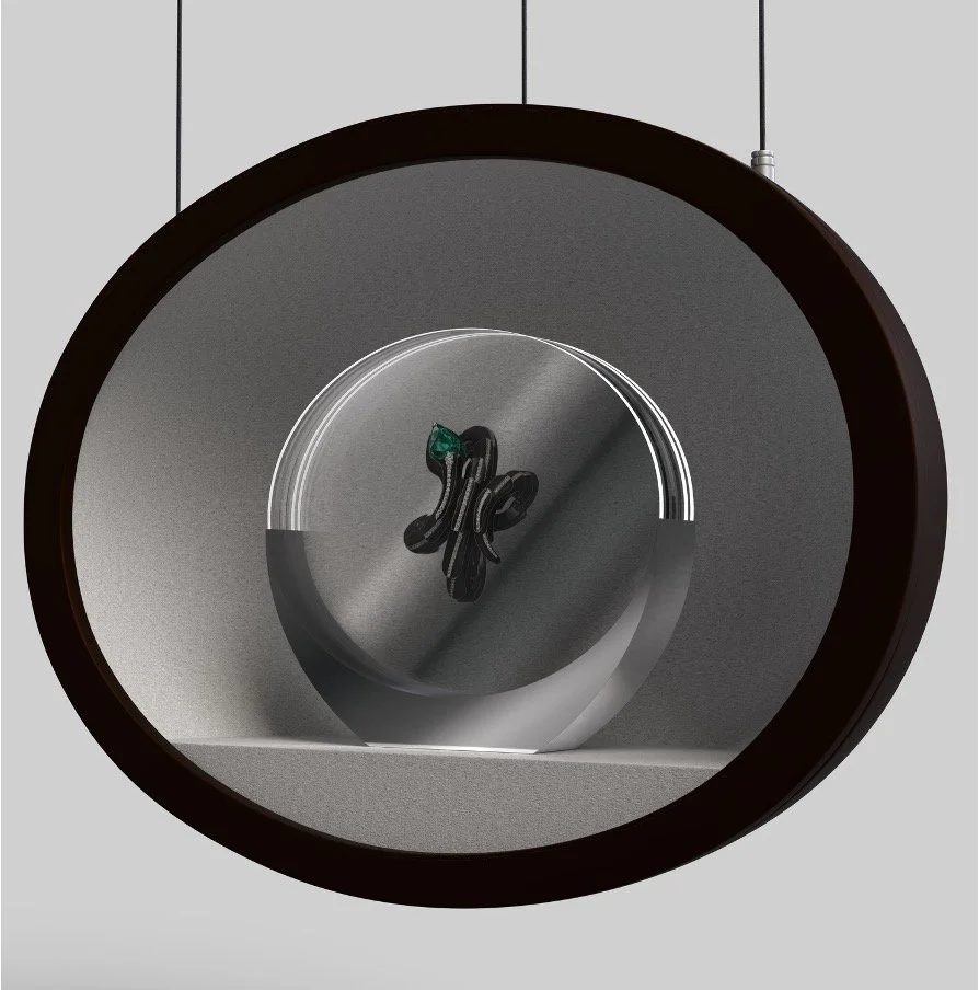 Printed Glass & Aluminum BaseA Layered Glass display to showcase the product when displaying the real pieces is not possible